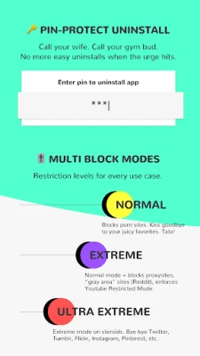 2 million+ porn sites blocked with a simple 1-tap setup! Select from different restriction modes: Normal, Extreme, Ultra Extreme.