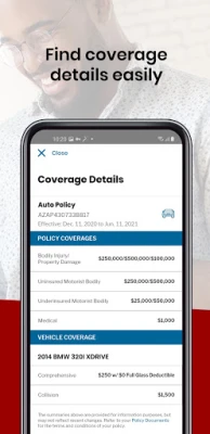 ● View Your Coverage Details — All your car insurance policy details are available to review, such as bodily Injury, collision coverage, uninsured/underinsured motorist coverage, and more.