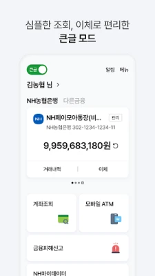 - 메인화면에서 큰글모드로 설정하여 조회, 이체를 큰글씨로 이용하실 수 있습니다.