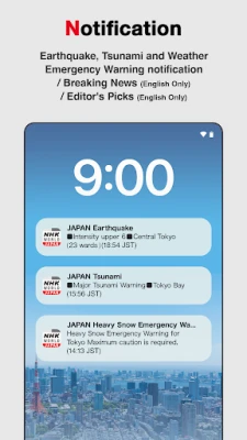 - Push notification of emergency information on earthquakes, tsunami and Weather Emergency Warning *Chinese, English, French, Hindi, Indonesian, Korean, Portuguese, Russian, Spanish, Thai, Vietnamese